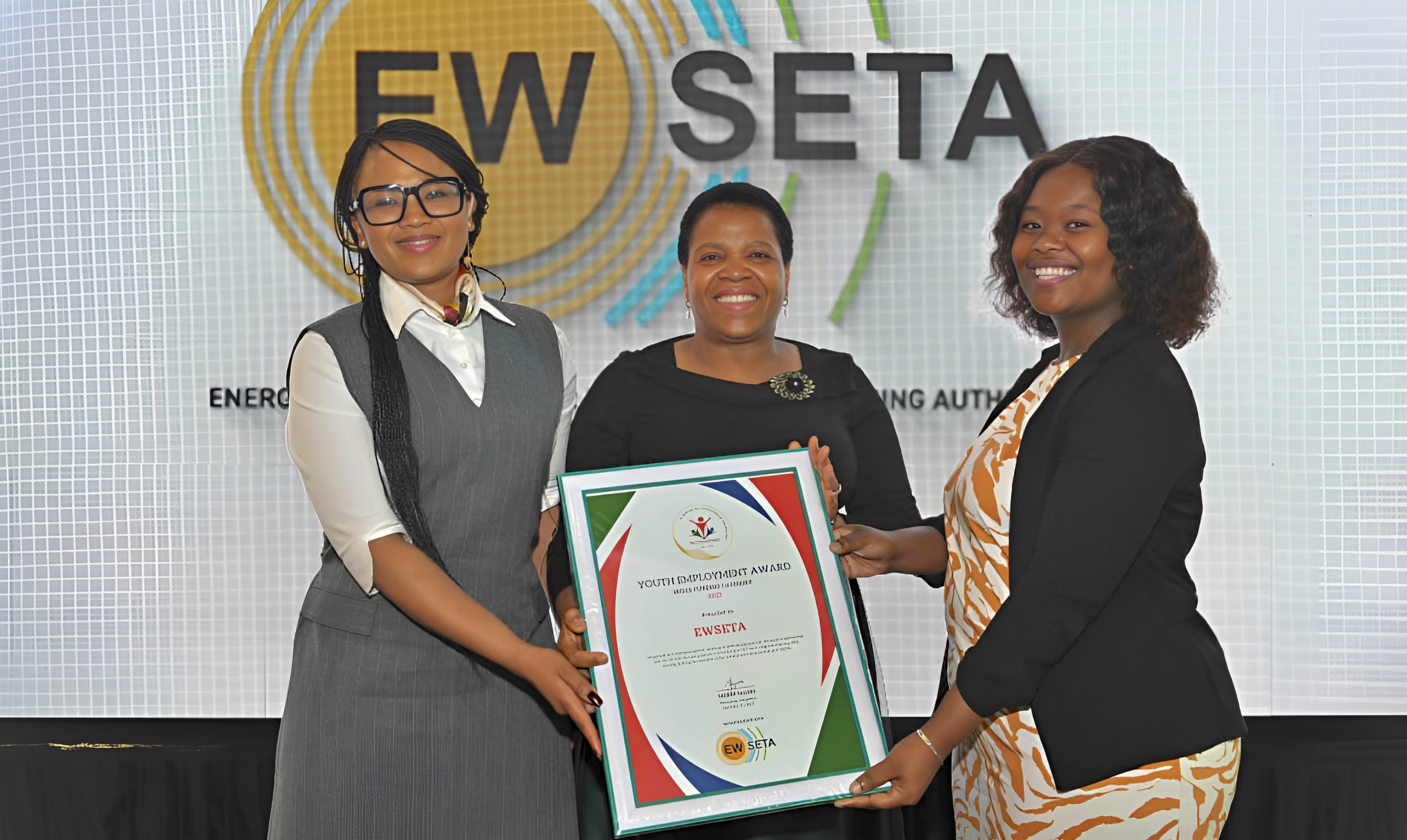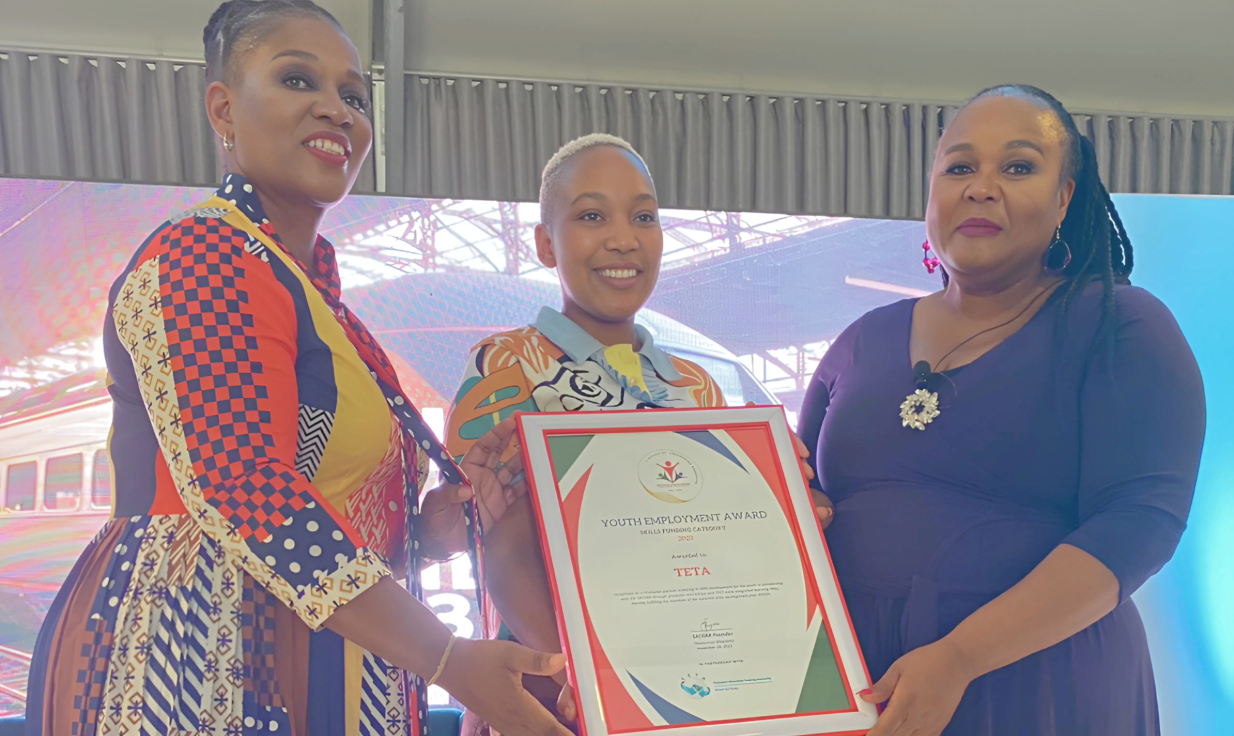 Youth Employment Award presented by Ms. Sebenzile Zulu, SACGRA Placement Supervisor, to Olive Rural Youth Skills Development. TETA intern Ms. Phumzile Ngcobo, Ms. Lindiswa Duman (Project Manager), and Mr. Walter Pitso (Admin Officer) were awarded for skills transfer to one of 60 TETA-funded learners. March 27, 2025 at Jet Park.